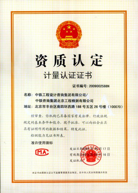 檢測公司是中關(guān)村高新技術(shù)企業(yè),具有國家認(rèn)證認(rèn)可委員會頒發(fā)的國家資質(zhì)認(rèn)定計量認(rèn)證證書,北京市建委頒發(fā)的“建設(shè)工程質(zhì)量檢測機構(gòu)”資質(zhì)證書,是鐵道部工程質(zhì)量安全監(jiān)督總站確定的“第一批鐵路建設(shè)工程質(zhì)量監(jiān)督檢測機構(gòu)”。
