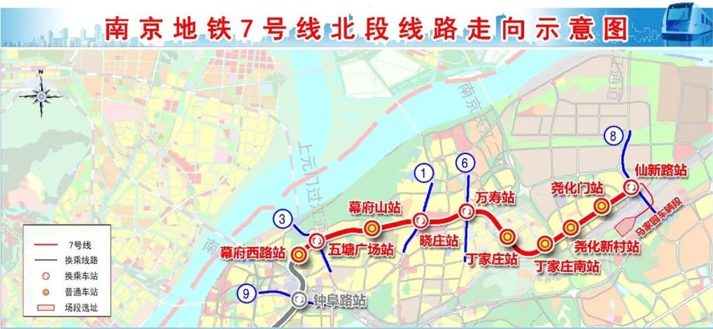 南京地鐵7號(hào)線(xiàn)北段工程西起幕府西路站,沿幕府西路、幕府東路行進(jìn),沿線(xiàn)設(shè)置五塘廣場(chǎng)站、幕府山站、曉莊站和萬(wàn)壽站,隨后向南轉(zhuǎn)入寅春路設(shè)丁家莊站,再向東轉(zhuǎn)入尖山南路設(shè)丁家莊南站,隨后沿堯佳路設(shè)堯化新村站、堯化門(mén)站,東至仙新路站。線(xiàn)路全長(zhǎng)13.836千米,設(shè)車(chē)站10座,均為地下車(chē)站,設(shè)區(qū)間9個(gè),設(shè)出入段線(xiàn)1個(gè),設(shè)車(chē)輛段1座。