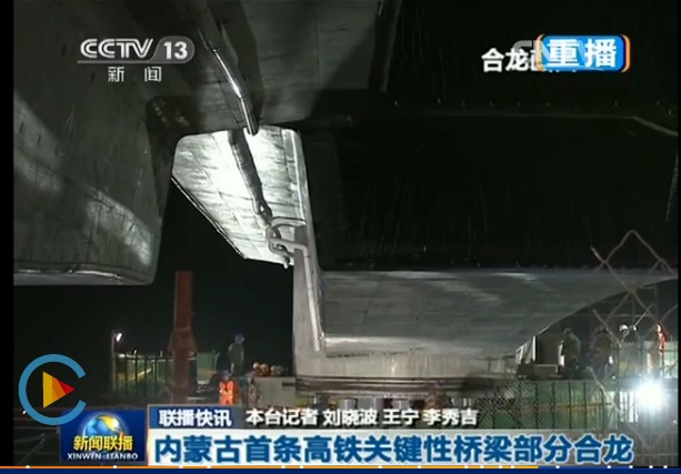 5月18日凌晨1點(diǎn)50分,由中鐵工程設(shè)計(jì)咨詢集團(tuán)有限公司設(shè)計(jì)的內(nèi)蒙古首條高速鐵路張呼鐵路蒙古營(yíng)印河特大橋40+56+40m連續(xù)梁38、39號(hào)墩梁轉(zhuǎn)體合龍圓滿成功,整個(gè)轉(zhuǎn)體過(guò)程用時(shí)37分鐘,大橋成功跨越集包二線。中央電視臺(tái)、新華社、內(nèi)蒙古電視臺(tái)對(duì)施工全程進(jìn)行了現(xiàn)場(chǎng)跟蹤報(bào)道。