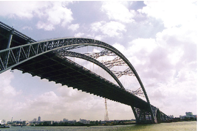 丫髻沙大橋位于廣州市環(huán)城高速公路東南三環(huán),橫跨水流湍急的珠江航道,有76+360+76米三跨連續(xù)自錨中承式鋼管混凝土拱橋、86+160+86米三跨連續(xù)預(yù)應(yīng)力混凝土剛構(gòu)和6跨40米預(yù)應(yīng)力混凝土簡支梁組成,全長1084米,其主跨360米鋼管拱在當(dāng)時(shí)全世界同類型拱橋中名列第一,同時(shí)創(chuàng)造了橋梁綜合轉(zhuǎn)體世界第一的技術(shù)指標(biāo)。